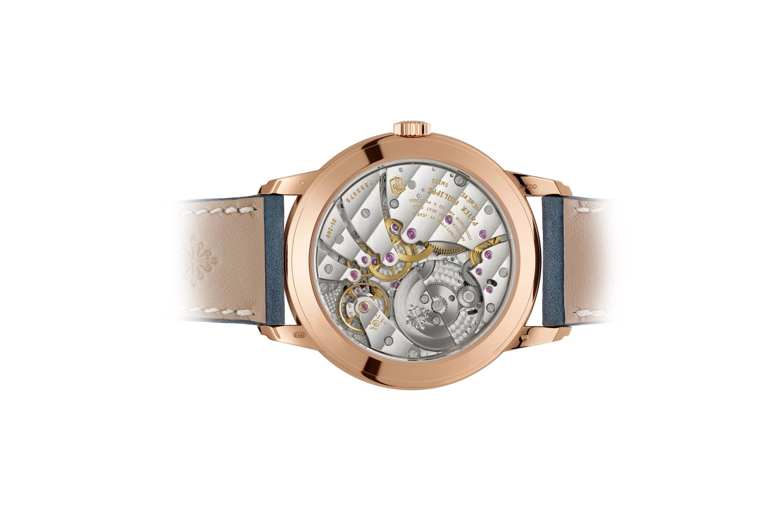 Đồng hồ Calatrava 24-Hour Display Time Reference 5224R-001 đi kèm với dây đeo bằng da bê màu xanh hải quân phù hợp với mặt số và khóa bằng vàng hồng.
