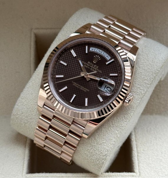 - Mặt quay số: màu nâu kẻ ô vuông,thanh chỉ giờ gắn kim cương